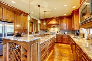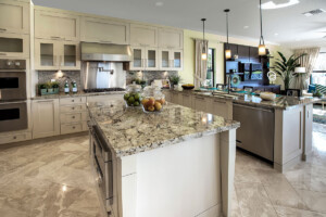 Custom cabinetry was replaced with a solid color grey veneer to accent and blend with the unique floor design. Granite counter tops were selected with a complementary grain design to match the overall color of the kitchen and eating area. Tile was extended throughout. Notice the similar handles of the appliances and lower and upper cupboard doors. Placing the microwave/convection oven in the island provided more versatility with cooking areas.