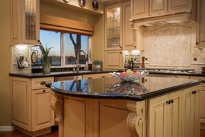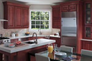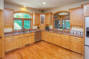 Using oak is an excellent choice for durability and beauty. As you can see, an island could have been added here, however keeping the floor open by using a wide-board composite flooring added to the overall beauty of this kitchen. Custom windows are the focal point and provide natural light with the high ceilings. Note the nickel finished hardware in this kitchen.