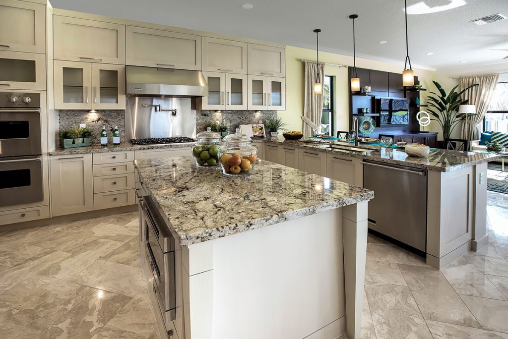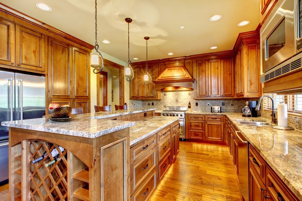 An expansive central kitchen island adds new counter space. With contrasting cabinet colors, it adds depth and elegance to a beautiful kitchen remodel.